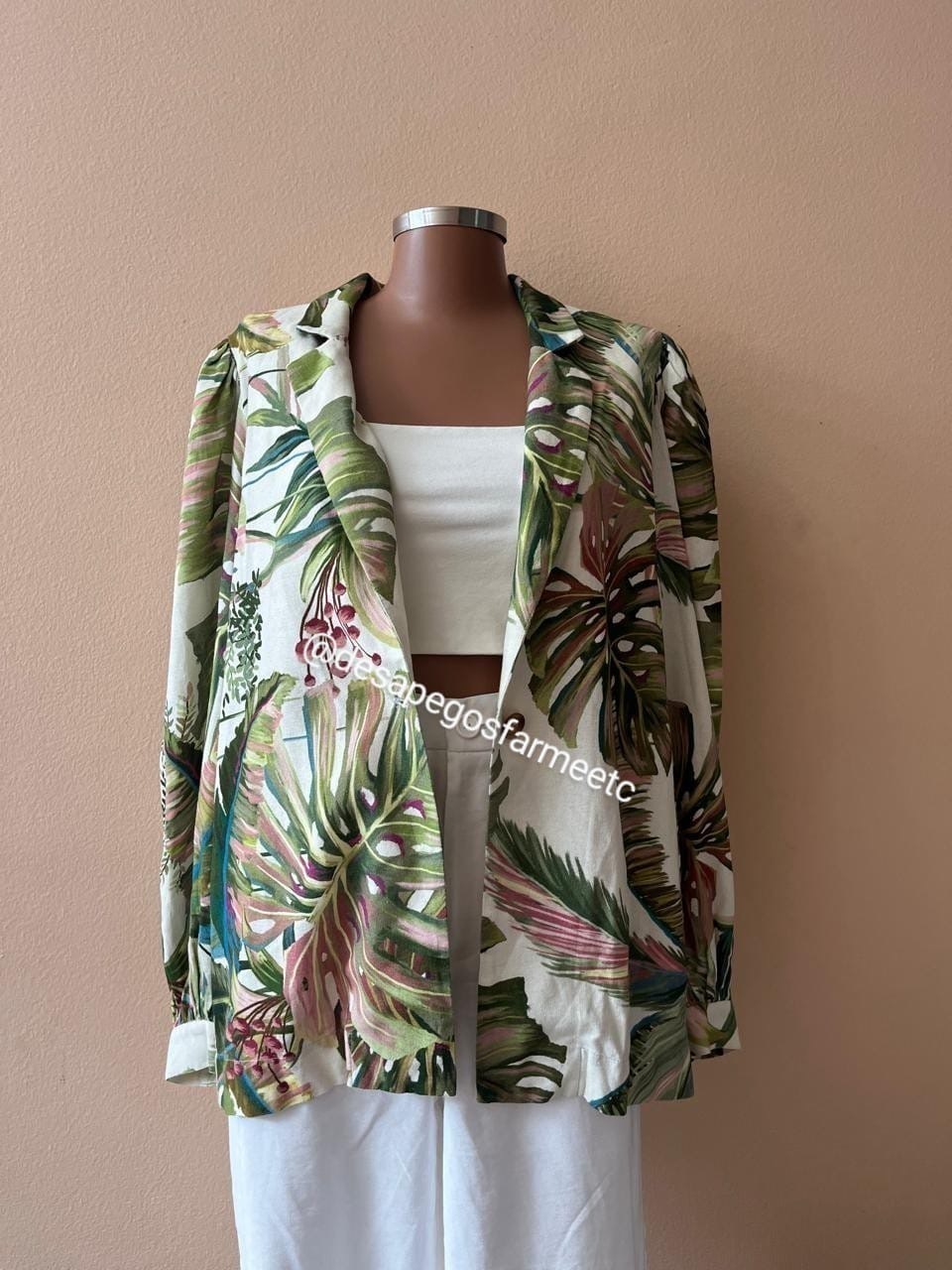 Blazer estampado Farm, disponível no tamanho P, modelagem maior vestindo M. Novo. Tecido: Viscolinho. Medidas Aproximadas: Largura: 108 cm (medidas tiradas com ele fechado) Comprimento: 68 cm