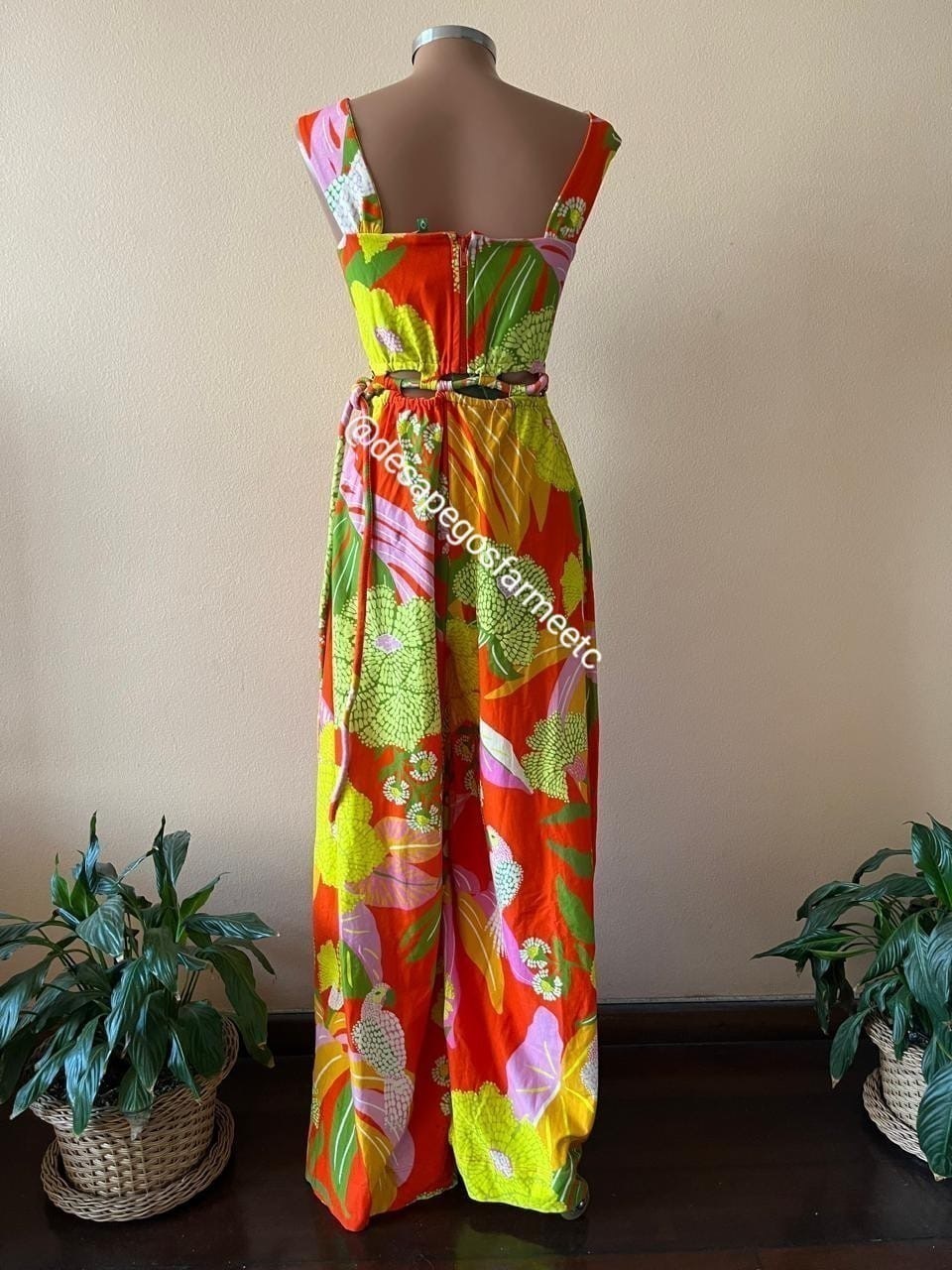Macacão divino estampa floral neon da Farm, disponível no tamanho P. Novo, com tag. Tecido: 100% algodão. Medidas Aproximadas: Busto: 88 cm Cintura: 68-80 cm Quadril: 114 cm Comprimento: 145 cm