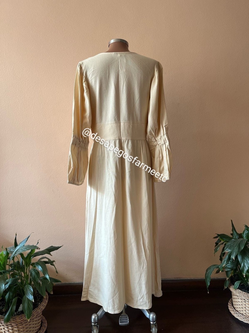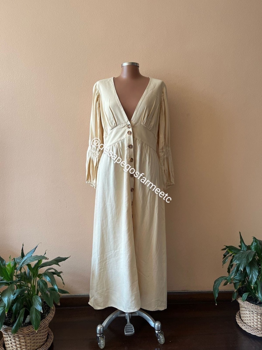 Vestido manga Bufante na cor areia da marca Farm, disponível no tamanho P, modelagem maiorzinha vestindo M. Tecido: 55% linho e 45% viscose. Medidas Aproximadas: Busto: 102 cm Cintura: 84 cm Quadril: 128 cm Comprimento: 127 cm